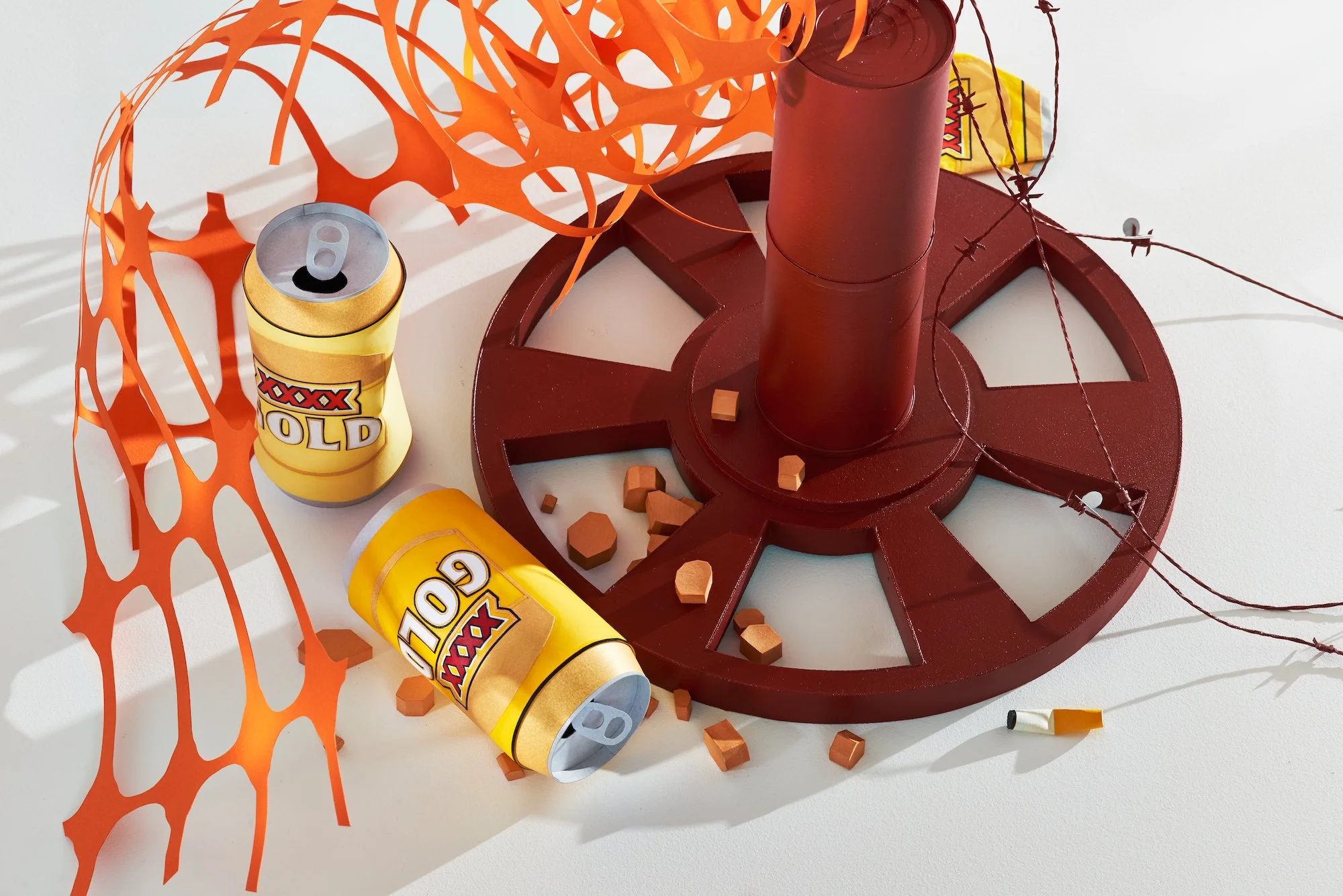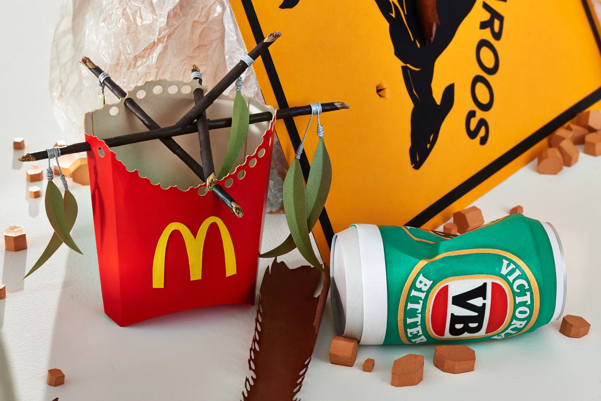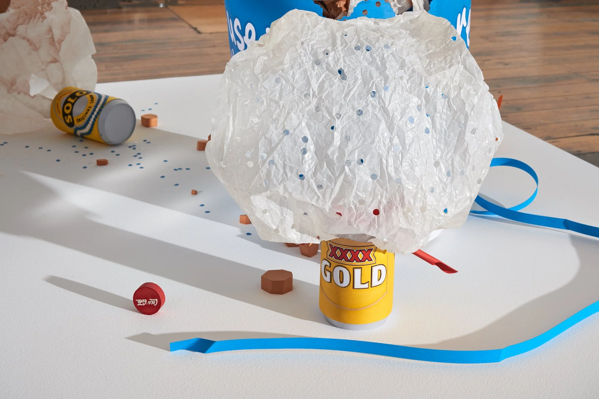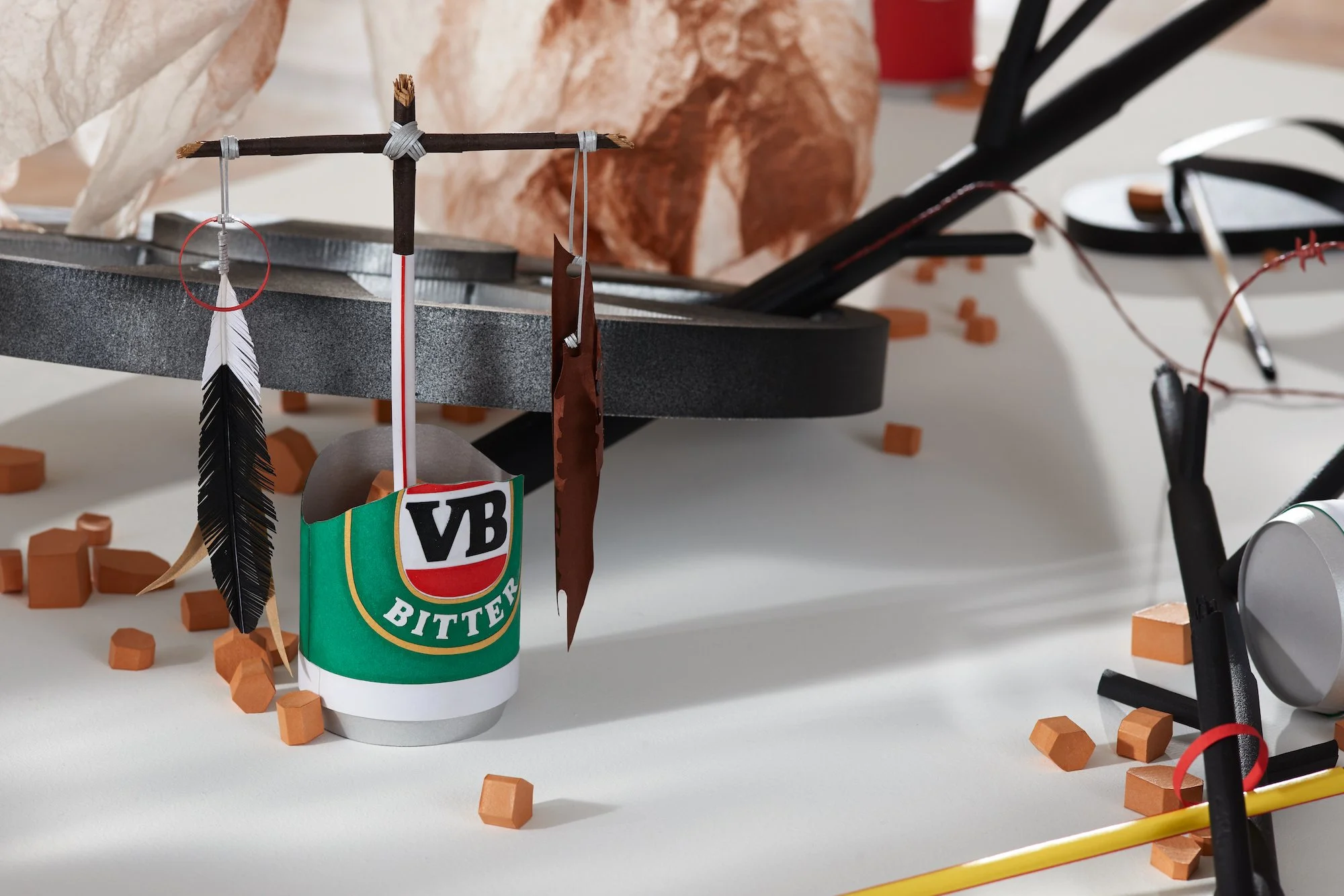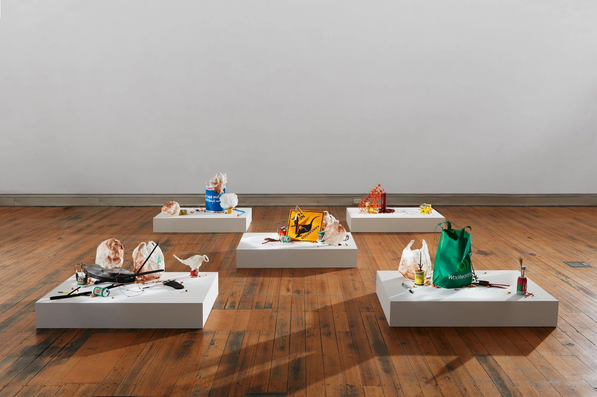 Mixed by sound artist Mieko Suzuki, the soundscape weaves field recordings collected from the desert with samples from Mad Max, Wolf Creek, Wake in Fright and Evil Angels. Displayed on plinths like museum dioramas, the paper model sculptural reconstructions draw on some of the detritus found on site, merging these fragments with preconceptions of the desert. Presented together as a sculptural and audio reconstruction, the installation suggests an experience of Central Australia that ambiguously collapses representations and realities into alternate narratives of place.