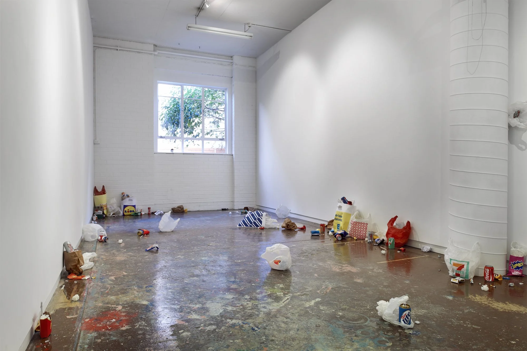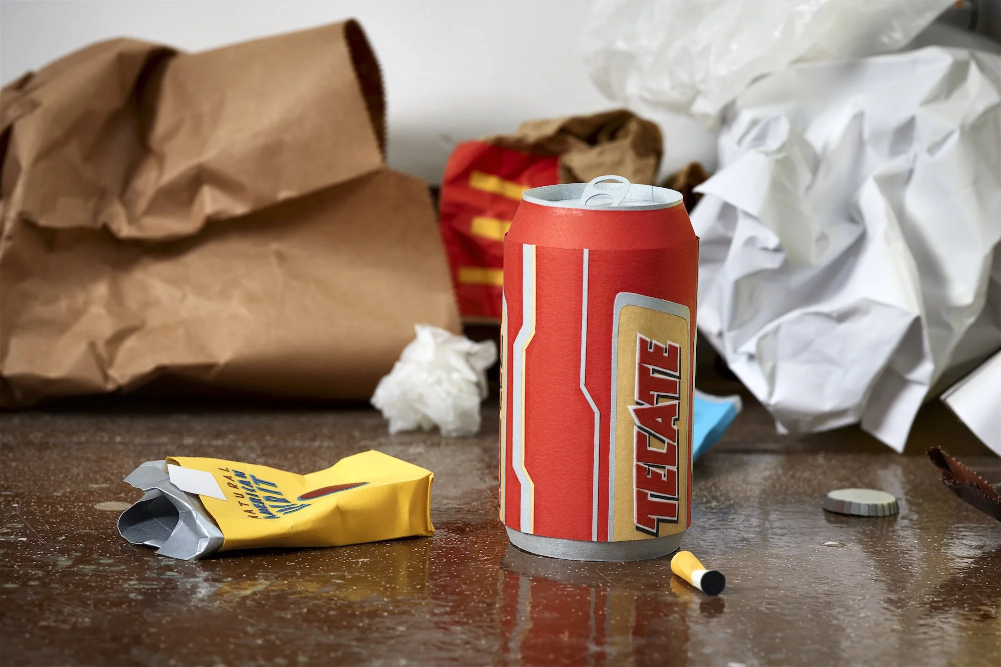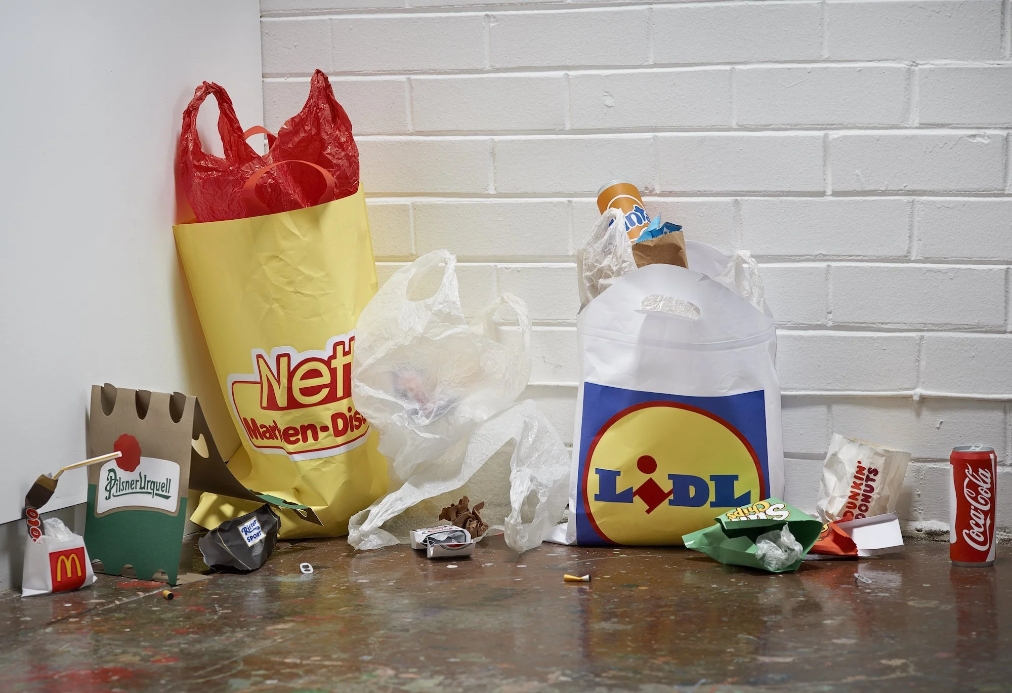 ’We’re all in this together’ is a sculptural and audio installation that reflects on how corporations capitalised on the global connectivity of the Occupy demonstrations. Ironically, the globalised ‘we’ of demonstrations was fabricated by brands such as Coca Cola to advertise the globalised ideals of their own products. The revolution and its radical chic became yet another commodity to market, a contemporary aesthetic. Mimicking the anarchy of the demonstrations, globalisation trashed itself for its own profit. Global antagonism became global ambiguity. In ‘We’re all in this together’ this ambiguity literally litters the space. Branded street litter from around the globe is fabricated as homogenous paper replicas and presented to us as the perfect model of trashed globalisation as generic design chic. Carefully constructing its own trashiness, the installation suggests a reality that merges radical destruction with its inevitable aestheticisation and commodification. Accompanying the ambiguity of the installation, and taken as its title, is Ben Lee’s controversial pop song ‘We’re all in this together’, which was used by Coca Cola to advertise the global connectivity of its product.