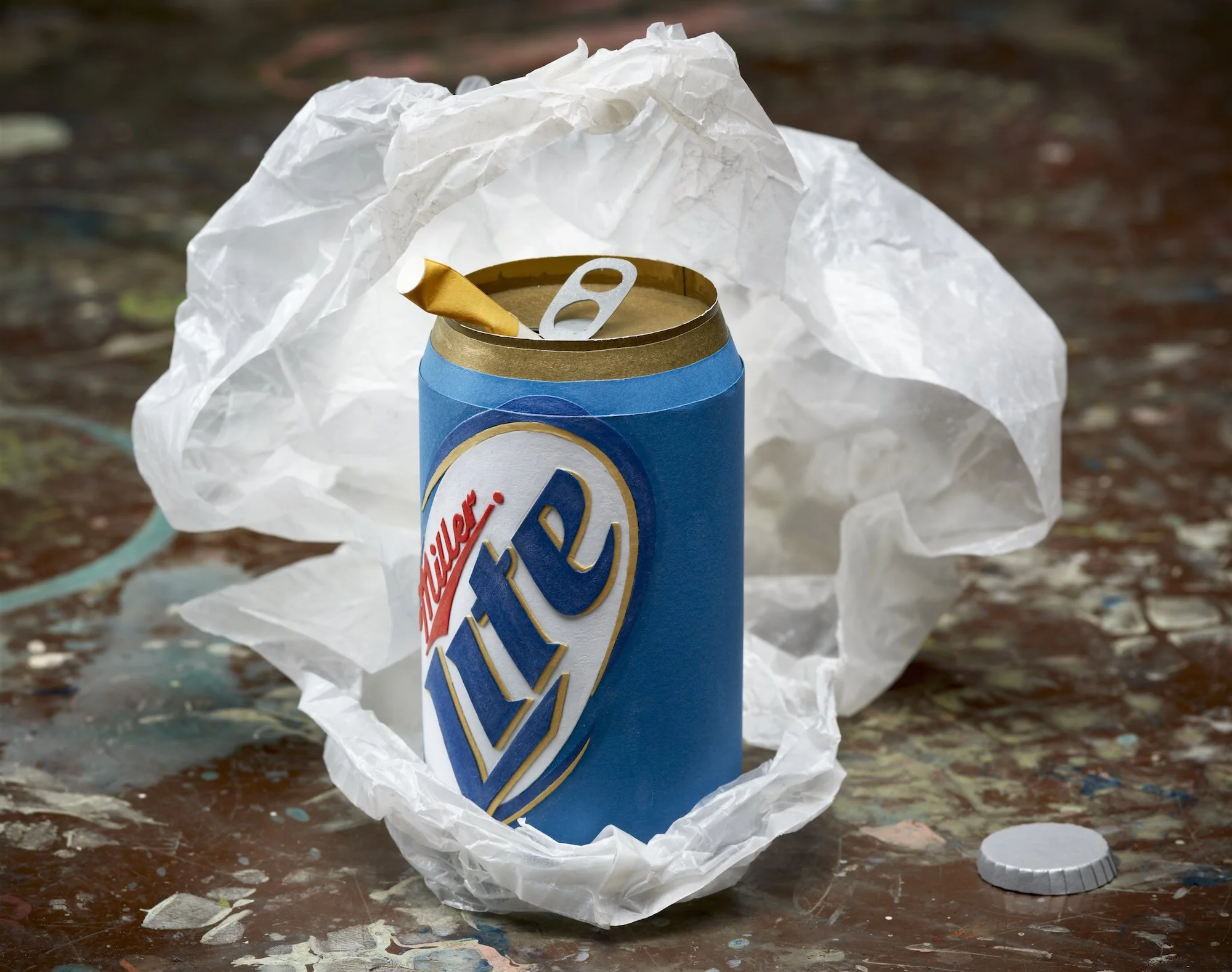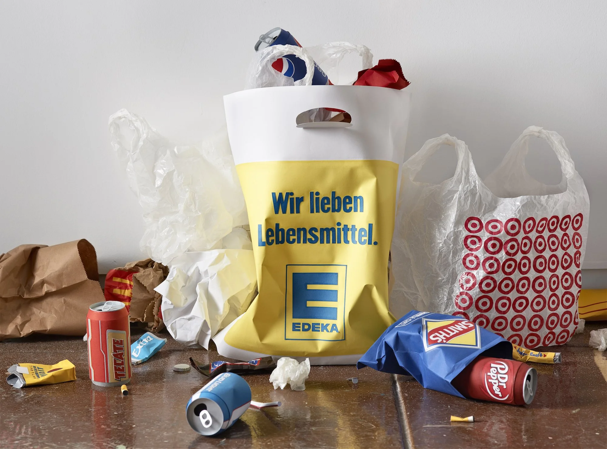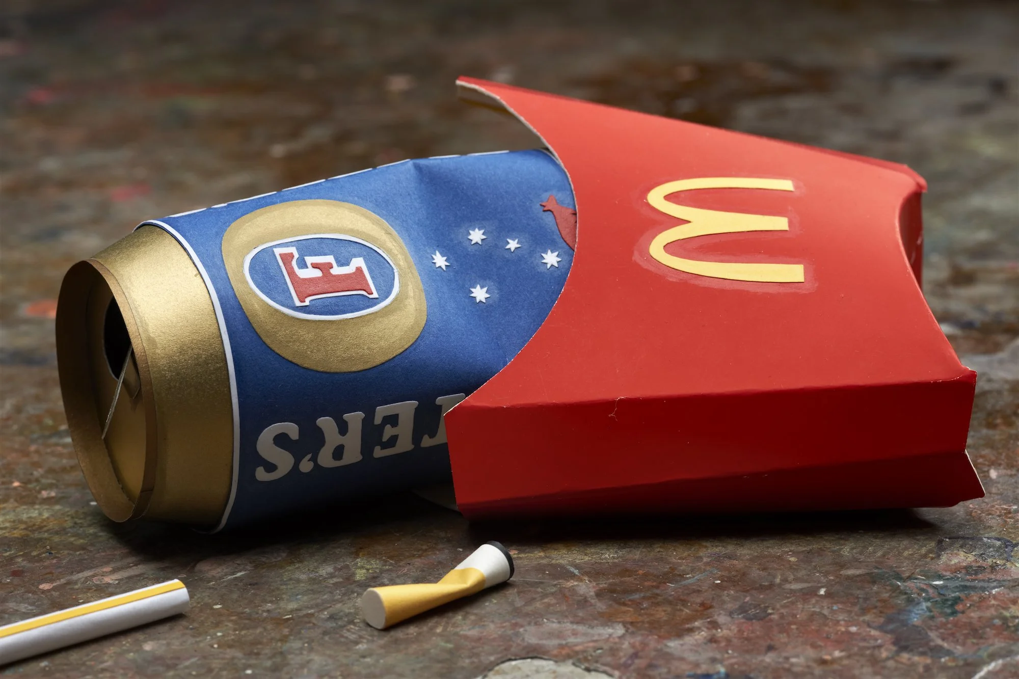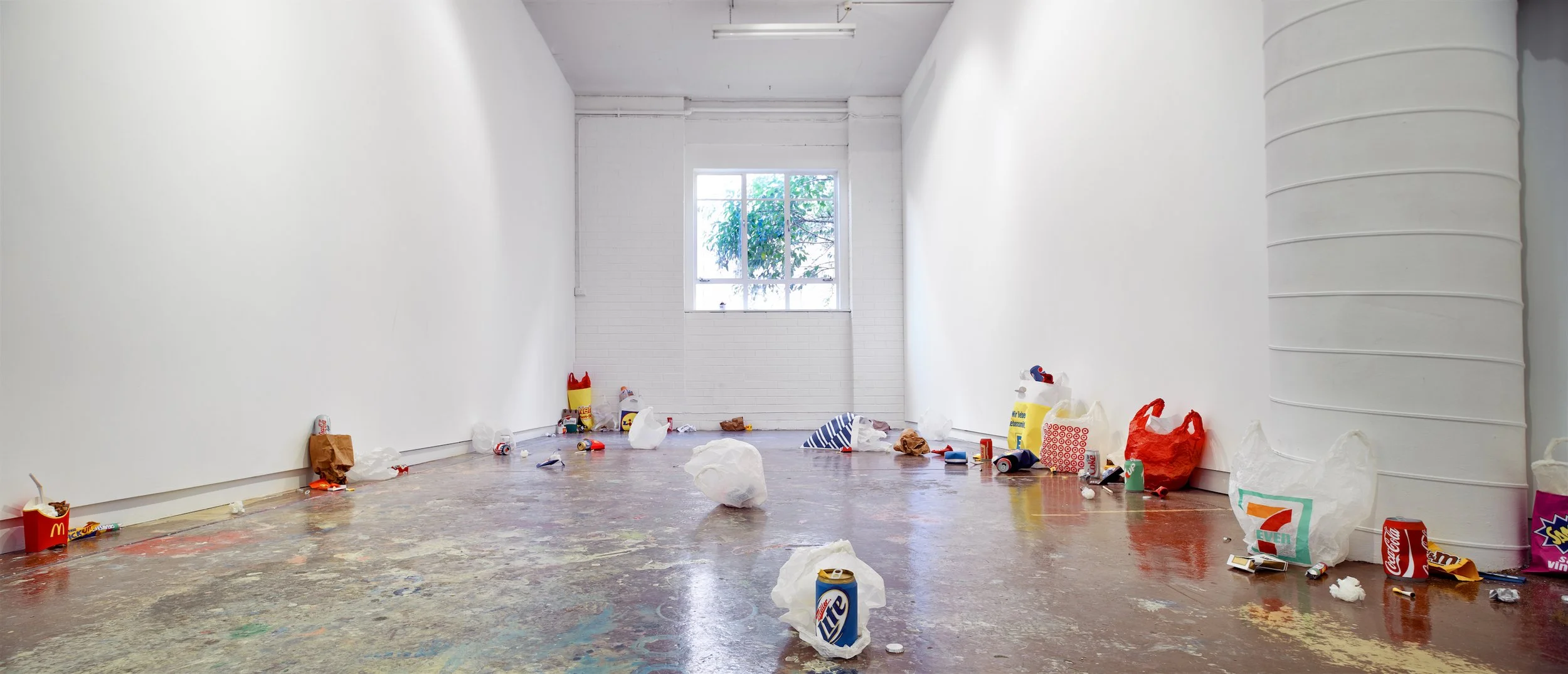 ’We’re all in this together’ is a sculptural and audio installation that reflects on how corporations capitalised on the global connectivity of the Occupy demonstrations. Ironically, the globalised ‘we’ of demonstrations was fabricated by brands such as Coca Cola to advertise the globalised ideals of their own products. The revolution and its radical chic became yet another commodity to market, a contemporary aesthetic. Mimicking the anarchy of the demonstrations, globalisation trashed itself for its own profit. Global antagonism became global ambiguity. In ‘We’re all in this together’ this ambiguity literally litters the space. Branded street litter from around the globe is fabricated as homogenous paper replicas and presented to us as the perfect model of trashed globalisation as generic design chic. Carefully constructing its own trashiness, the installation suggests a reality that merges radical destruction with its inevitable aestheticisation and commodification. Accompanying the ambiguity of the installation, and taken as its title, is Ben Lee’s controversial pop song ‘We’re all in this together’, which was used by Coca Cola to advertise the global connectivity of its product.
